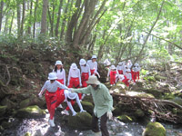 | 蓼科山荘裏手にある川の上流を歩きました。ごつごつした岩を渡りながら、川の成り立ちを学習しました。 |