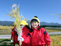 | 一面、黄金色となった田んぼをみて、児童達は「きれい」と声をあげていました。重みで頭を垂れた稲の一束を握り締め、丁寧にはさみで刈り取りました。 |