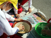 | 稲穂の観察記録を取ったあと、『もみすり』を2種類の方法で行いました。「すり鉢にボール」、「瓶にすりこ木」でもみをすり、玄米になるまでもみ殻を取り除きました。 |