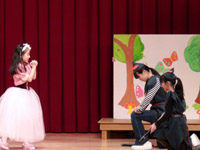 | 英語劇「ラプンツェル」に挑戦した英語クラブ。舞台の動きにあわせたナレーションもうまくいきました。 |