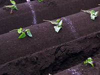 石灰で目印がつけられた畑に1人8本の苗がありました。