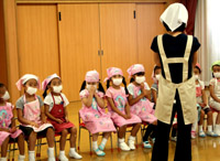 この日のために、お家でエプロン・三角巾の着け方を練習しました。