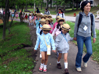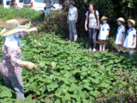 | 帰り道に、5月の園外保育でさつまいもの苗を植えた川越の荒幡農園を訪れ、大きく成長した様子を観察しました。 |
