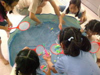 | 山荘にもどって、夕涼み会が行われ、くじ引きやあめのつかみどり、スーパーボールすくいなどを楽しみました。 |