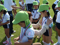 学園長先生、園長先生からメダルがかけられました。自信に満ちた笑顔が輝いていました。
