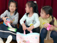 お買い物をすませたおともだちは、買ったものを見せ合いました。