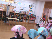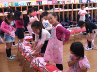 | 先生が片付けをしている間に、率先してエプロンをたたむ姿に、年長さんの成長ぶりがうかがえました。 |