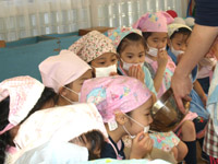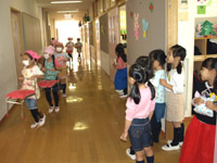 | お料理教室は、小さいお友だちにとって憧れの行事です。エプロン姿が気になりみんな廊下へ。 |