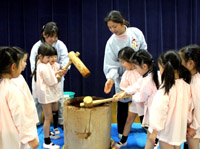 杵でつぶしこねたもち米をみて、「ご飯がお餅になっている」と驚いていました。このあとからが年長組さんの出番です。