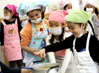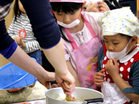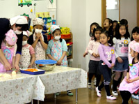 年少・年中組がお料理教室を見学にきました。みんな興味津々です。