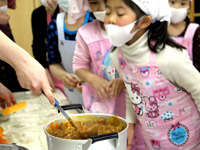 先生が切った野菜を炒め始めると、保育室の中を良い匂いが漂い始めました。