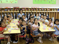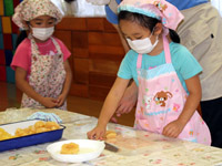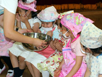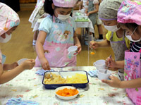 全3回のお料理教室。第1回目の今回は、フルーツゼリーを作りました。エプロン・三角巾・マスクを着けて準備万端の園児たち。先生から作り方の説明を受けて、ゼリー作りに挑戦です。年中組のお友だちは、お姉さんたちの様子が気になるようです。 |