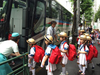 | 小講堂でおうちの方に出発のご挨拶をし、バスに乗車。年長さんは、目白通りからのお見送りに笑顔で手を振っていました。 |