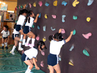 | 佐久市子ども未来館で様々な楽しい体験学習をしました。写真はロッククライミングに挑戦している様子です。 |