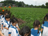 | 帰りには川越のさつまいも畑を見学しました。葉が生い茂り、1枚1枚がハートの形をしていることに気づきました。秋にはおうちの方と一緒のおいも掘りが待っています。 |