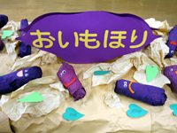 | いもほり遠足で掘ったおいもを思い出しながら、新聞紙を丸め、色を塗りました。目や口をつけてユニークなおいもに仕上がりました。 |