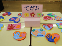 6月の参観日におうちの方と一緒に作った手形に絵の具で色を塗りました。