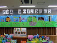 | 8つのグループに分かれて、園庭の絵を描きました。その上に「動いているわたし」の絵を貼りました。 |