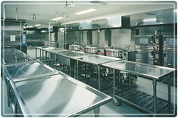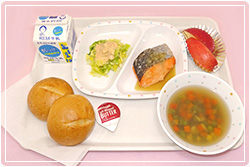 本校では給食のことを「会食」と呼んでいます。その歴史は古く、本校創立の年より続いています。当初は調理実習やマナー習得を兼ね、実地教育の一貫として生徒がサンドイッチなどを作るというものでした。現在は小学校校舎の厨房で調理を行い、温かいものは温かいうちに、冷たいものは冷たいうちにと、心をこめて手作りした食事を皆でいただきます。