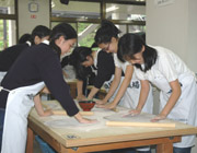 そば道場では、そば打ち体験に真剣に取り組みました。説明を聞きながら、手際よくそばをこね、そば切りも各自で行いました。昼食時に食べた手打ちそばの味は、もう最高でした。