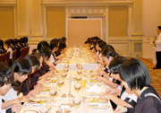 中学校がテーブルマナー教室をリーガロイヤルホテル東京にて行いました。フレンチのフルコースを、講師の方にご指導を頂きながら美味しく頂きました。テーブルマナーで大切なのは、ナイフ・フォークの使い方だけでなく相手への思いやりであることがよくわかりました。 |