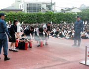 中高合同の避難訓練が行われました。地下調理室から出火したという想定で、生徒たちは落ち着いて第一グラウンドへ避難することができました。消防署長から、「静かに落ち着いて良くできました。但し今後は、廊下に煙が充満していた場合や、地震のためガラスが床に散乱していた場合を想定して避難訓練を重ね、一歩ずつ前進するように心がけることが大切です。」というお話をいただきました。そして、生徒及び教員による消火器を使った消火訓練と、グラウンドから第2避難場所への移動訓練も行われました。 |