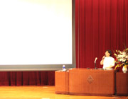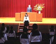 7月の講堂朝礼では警視庁目白警察署生活安全課の方から、「夏休みの防犯と対策について」というテーマでお話がありました。実例や映画を交えて、携帯電話のメールやブログ、プロフに関する諸注意がありました。もしも何かあった場合には一人で悩まず、必ず親や先生、警察に相談するようにということも付け加えられました。 |