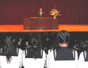 | 9月の講堂朝礼は誕生者のお祝い、吹奏楽コンクール・コーラス部が参加したNHK音楽コンクール・陸上部個人種目の受賞者の表彰式が行われました。その後、教務担当の先生より、「なぜ勉強するのか」をテーマにお話がありました。勉強することは人生の幸せにつながるということで、そのための5つの条件を教えていただきました。 |