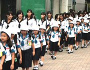 | 防災の日の9月1日、川村学園では初めての試みとして小・中・高合同の通学組合下校訓練を実施しました。各校各通学組合班で人員確認を行って職員室に報告し、小・中・高すべての確認終了をまって第2ピロティーに集合しました。ここで各班別に中高生が同一方面の小学生と合流し、隊列を組んで目白駅やバス停などに向かいました。教職員も駅構内での歩行や乗車の指導を行いました。 |
