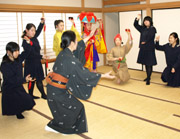 後期から始まった中学3年生の選択授業「琉球舞踊」の最終日は、今までの成果を発表する試験が行われました。その後、代表生徒3名が沖縄の伝統的な衣装を身に付け、先生から着物や着付け、帯などの説明がありました。帯に使われている五つと四つの市松模様には「いつ(五つ)の世(四)までも一緒に」という意味が込められていることに、特に関心を持ったようです。最後は全員で輪になり、四つ竹を鳴らしながら総仕上げとして舞いました。 |