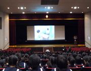 4月講堂朝礼が行われ、1年生に講堂朝礼の所作を確認しながら進行しました。講話では、目白警察署生活安全課の方より、防犯に有効な知識を教えていただきました。有害サイト等への書き込みにより身に降りかかる危険な一面を映像で確認しました。また、痴漢から身を守る護身術も教えていただきました。頭の片隅にとどめておきたい電車やエレベーター内での防御法がいくつもありました。 |