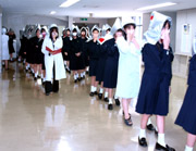 中高合同で避難訓練を実施しました。地震後に火災が発生したことを想定し、クラスごと一列で、ハンカチで口を覆い、第1グラウンドまで避難しました。中高では、年数回避難訓練を実施し、移動教室の際も防災頭巾を携帯し、災害時に自分の身を守れるようにしています。 |