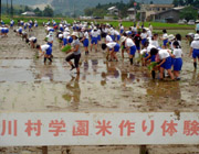 中学1年生は「土」をテーマにした総合的な学習の一環として、田植えを体験しました。農業団体の方から説明を受け、苗を手にいざ田んぼへ。最初の一歩を踏み入れるのに勇気が必要な生徒もいましたが、次第に土の感触に慣れ、熱心に丁寧に楽しみながら約1時間の作業を行いました。農家の方の苦労やお米のありがたさを実感する一日を過ごし、秋の収穫に期待をしながら田んぼを後にしました。 |