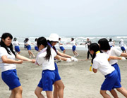 中学2年生は「水」をテーマにした総合的な学習の一環として、今回は海での体験学習を実施。ほとんどの生徒が初めてとなる地引き網を行いました。仕掛けられた網の両端を菊・桜組と蘭・藤組に分かれて、力加減のバランスをとりながら何度も何度もたぐり寄せました。開始から約30分でドチザメやアジ、イワシなどの魚が姿を見せました。桶2杯の魚を皆熱心に観察していました。 |