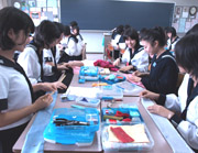 川村学園の伝統行事「記念作業」が行われ、シュシュやミニトートバック、ストラップなど各クラスで様々な作品を制作しました。奉仕の気持ちを込め、手作りの楽しさを味わいながらの作業で完成した作品は、どれも温かみと個性が溢れています。 |