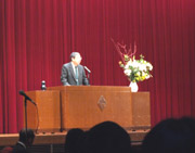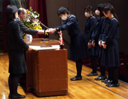新型インフルエンザの感染者が多く中止が続いていた講堂朝礼でしたが、12月は実施することができました。9月からの誕生者祝い、級長・副級長任命、マラソン大会や鶴友会クラブの各種表彰、そして副校長の話から、今年後半の学校生活を振り返りました。研修旅行や学園祭などの行事を取り上げて精一杯臨んだ頑張りを称え、今年を締めくくりました。 |
