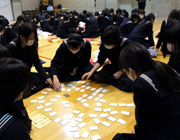 今年で40回目となる3年生の百人一首大会が行われました。クラス混合の20グループに分かれて札を囲み、枚数が少なくなるほどに盛り上がり、接戦となりました。獲得枚数を集計し、クラス平均1位の蘭組と個人上位3名が表彰されました。4月から12月までの古典で勉強し、冬休みに復習したことの成果を発揮する良い機会となりました。 |