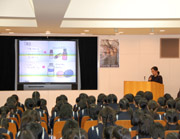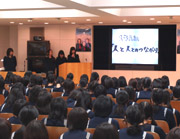 高校1年生が考察してきた「共生」の集大成として学年の発表会を行いました。クラス発表で互いに評価し合った結果選出された代表グループが、小講堂の壇上で順番に発表しました。プロジェクターに映し出される資料の充実ぶりや実演を盛り込んだ構成によるわかりやすい発表に、高い関心を寄せながら最後まで集中して臨むことができました。 |
