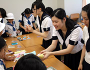 Catholic Collage」の生徒と久しぶりの再会をし、現地では、語学相互学習ををはじめ、書道や折り紙、クッキングなどを通して交流を深めました。 |