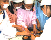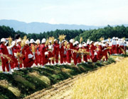 春に田植えをした田んぼを訪れ、一人一株ずつ稲刈りをしました。田んぼでの体験から、いつもおいしく食べているお米に関するさまざまな知識を身につけることができました。 |