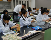 竹組はフラワーアレンジメントに挑戦。ガーベラやデンファレなど4種類の花材をそれぞれが自分のセンスで組み合わせ、好みのデザインでオアシスに挿し、きれいな作品に仕上げました。 |