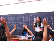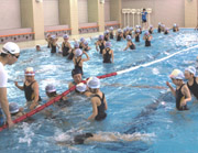 小学校では1・2学期に2時間続きで水泳授業を実施しています。この日は1年生の3回目の授業で、勢いをつけてもぐるイルカジャンプや全身を沈めてコースロープをくぐり抜ける練習を繰り返しました。 |