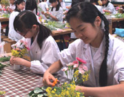 心のゆとり教育として5・6年生が取り組んでいるお茶とフラワーアレンジメントです。土曜授業を利用して、今回は、6年松組がフラワーアレンジメントを行いました。楽しみながら、自分の作品に愛着をもって完成させていきました。 |