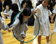1年生は、体育館で保護者の方とレクリエーションを行いました。お友だちと手をつないだままでフラフープをくぐり、お隣へまわしていきます。練習では、フラフープをお隣へまわすのに時間がかかりましたが、本番では、お互いの手を上げたり下げたりするなどの工夫をして、スムーズに渡すことができました。最後に、全員で輪になりダンスを踊りました。 |