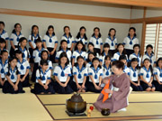 豊かな心を育む時間として、5・6年生は茶道とフラワーアレンジメントを行っています。6年松組の茶道では、お茶の先生より「5年生の時の経験を生かした立ち居振る舞いがしとやかで、最上級生の自覚が見受けられる。」とお褒めの言葉をいただきました。先生のお点前をじっくりと拝見し、その後は実際に丁寧にお茶を点て、お菓子に感謝していただく茶道の心を学びました。 |