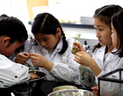 5年生は理科の授業でメダカの観察をしています。毎朝お当番は、水草の掃除、えさやり、水草を一本いっぽん丁寧に調べ、卵が産みつけられていないかの確認などを行います。卵が産みつけられていた水草は別の容器に移し、ふ化するのを待ちます。約12日ほどでふ化した稚魚は、体長の大きなメダカに食べられないように稚魚用の大きな水槽に移され経過観察します。そのほかに卵や稚魚を顕微鏡で観察します。 |