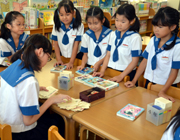 東日本大震災で被災された方へ引き続き支援をおこなうため、第2回義援バザーが中高校舎で開催されました。今回は、幼稚園から高等学校までが協力して行いました。園児と児童は家から品物を持ち寄り、保護者の方の販売の協力をお願いしました。中高生は、一人ひとりが心を込めて作った品物を販売しました。園児と児童は会場の品物を見てまわり、お気に入りの品物を購入していました。 |