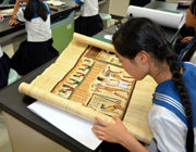 新学期が始まり、科学クラブでは、学園祭の展示に向け「パピルス」のしおり作りをしました。その中で先生がエジプトで購入したパピルス紙(鑑定書付き)に描かれた文書をじっくり見ている様子が印象的でした。クラブ活動の後半は、おろしたにんじんと漂白剤(ワイドハイター)をフィルムケースに入れ、「にんじん爆弾」を作りました。これは、漂白剤がにんじんの酵素によって分解され、発生する酸素の圧力でふたが飛ぶ実験です。 |