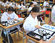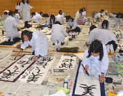 4年生以上は条幅の作品を仕上げました。会場の体育館とフリールームは熱気に包まれ、練習の成果を全て出し切ろうと3枚の条幅に集中する姿がありました。 |