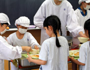 1年生が6年生と一緒に配膳の準備を行う会食当番が始まりました。お当番さんはエプロン、帽子、マスクをつけ、お姉さんたちに教えてもらいながら配膳を行いました。 |